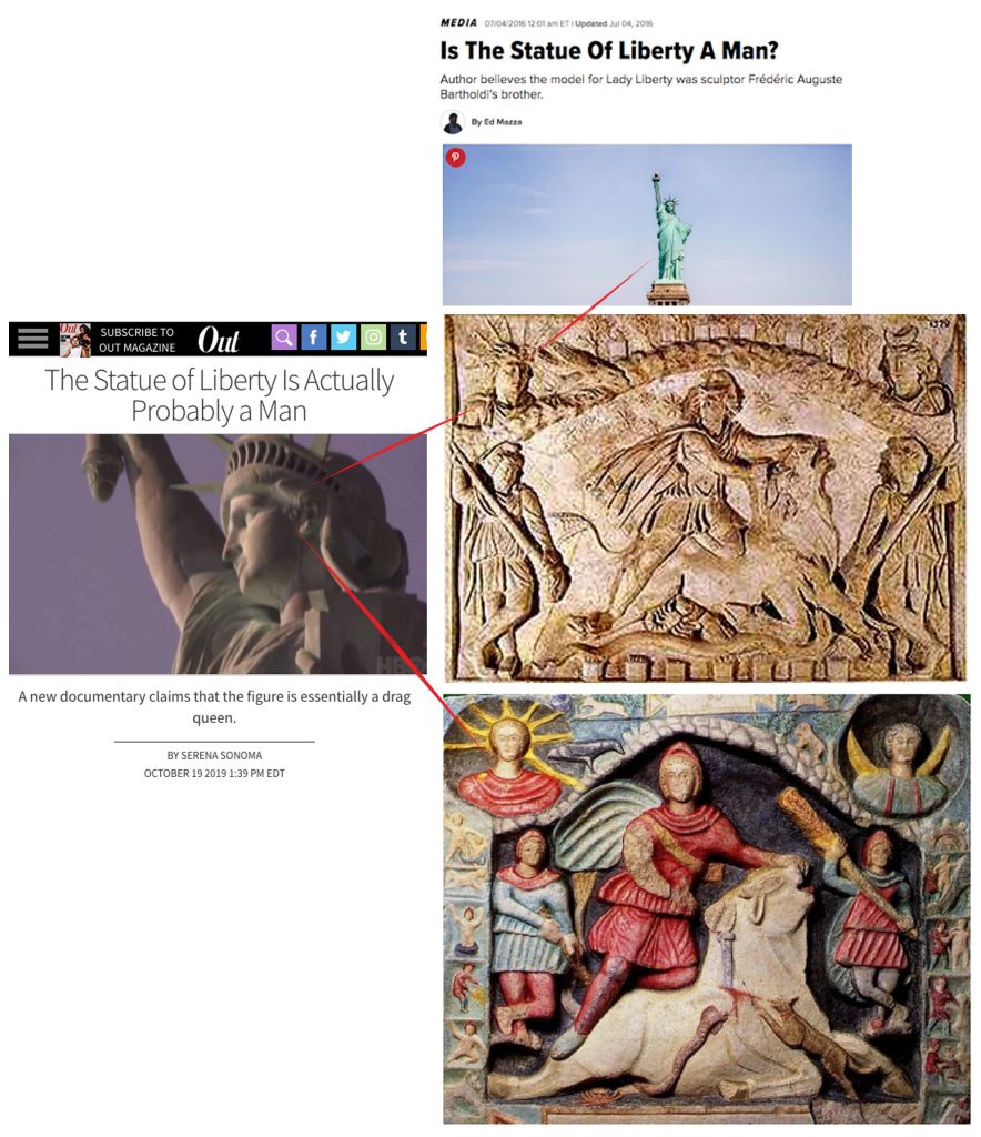 Lady Liberty has a symbolic parallel to the Sun God of Mithraism (Helios), but not to Mithras, who is a cosmic being. The Sun God is male, while Lady Liberty is female. In a conspiracy-theory sense one could argue that there is a deliberate attempt to perplex the subconscious by State Cults who manage perceptions to confuse the spirit that follow ancient cults. Or is this a subconscious initiation for the people brought about deliberately or by accident, where the anima and animus converge in one artifice? The Moon Goddess of Mithraism is Luna/Selene, yet she receives little attention. Within the slaying bull depiction there are two torchbearers, they represent each end of the equinox their crossed legs symbolising that. Incidentally Lady Liberty holds a torch also, thus fulfilling three key Mithraism symbolic meanings. Is this part of a state cult’s intention to conceal an agenda, or is it merely coincidental, alongside logistical reframing to save time and labour costs?
