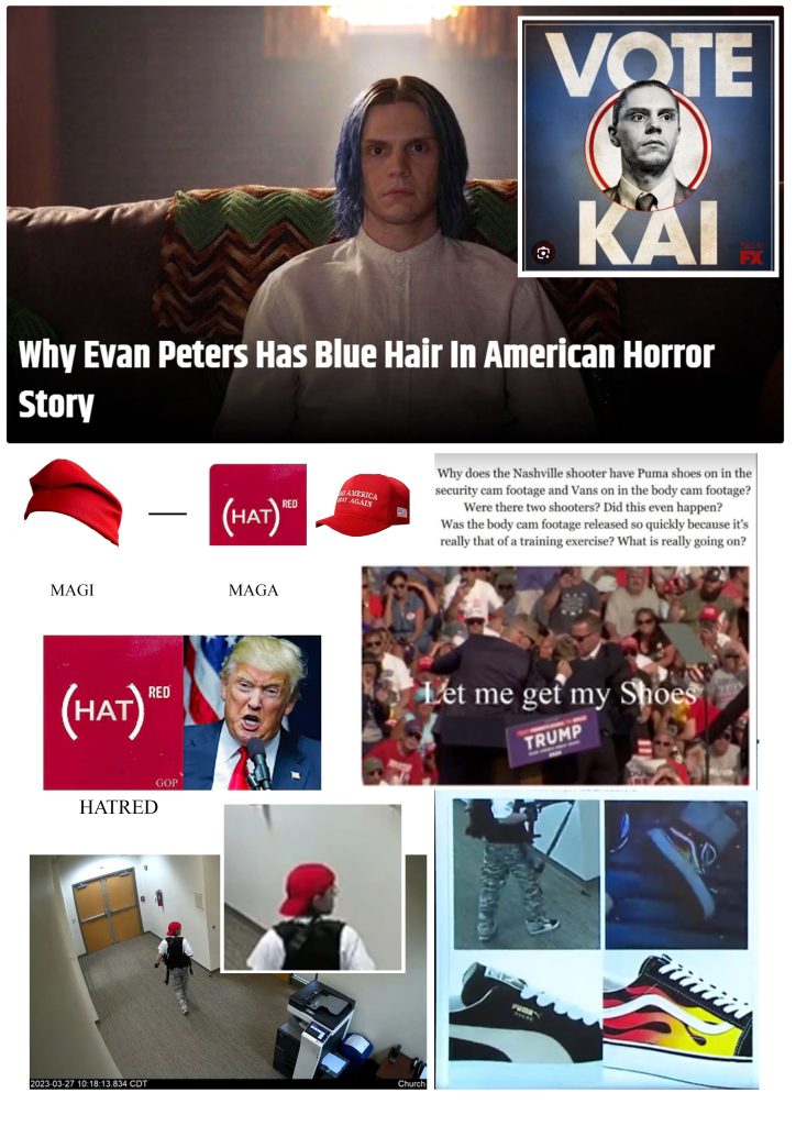 Kai Anderson is a manipulative, power-hungry cult leader who uses fear and chaos to gain control, embodying both radical political extremism and toxic masculinity. He represents right-wing nationalist extremism, and his blue hair serves as a symbol of a more “woke” ideology. Kai gathers followers reminiscent of Nazi-like groups to narrate the story of the Jonestown Massacre. This is juxtaposed with a false-flag shooting in Nashville, carried out by a transgender woman wearing a red hat, which symbolises hatred. This contrast between the red hat and Kai’s blue hair highlights symbolic contradictions. The name “Kai,” which means “sea” in Japanese, is significant because it draws inspiration from Trump’s 2016 election, which fuelled the character’s terrorist arc in the show’s narrative. It’s suggested that Trump has been synchronistically associated with various archetypes, such as Ahriman, a MAGA hero (an inverse of Perseus holding Algol’s head), and the Beast from the Sea, often represented as a seven-headed creature. Additionally, the Nashville shooting involved three children and three adults who were not killed, making a total of six fatalities. When combined, these numbers result in 33, which raise further questions about hidden meanings and connections.